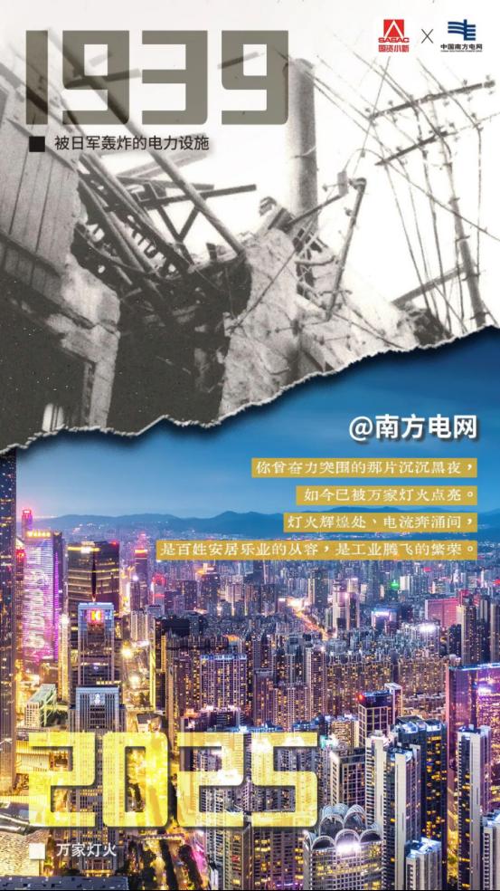 80年后的今天,城市农村灯火彻夜通明。前辈们曾拼死守护的电力火苗,以燎原之势镌刻下世界级湾区电网、直流输电工程、“特高压”国家名片等闪耀印记。灯火辉煌处、电流奔涌间,是百姓安居乐业的从容,是工业腾飞的繁荣!